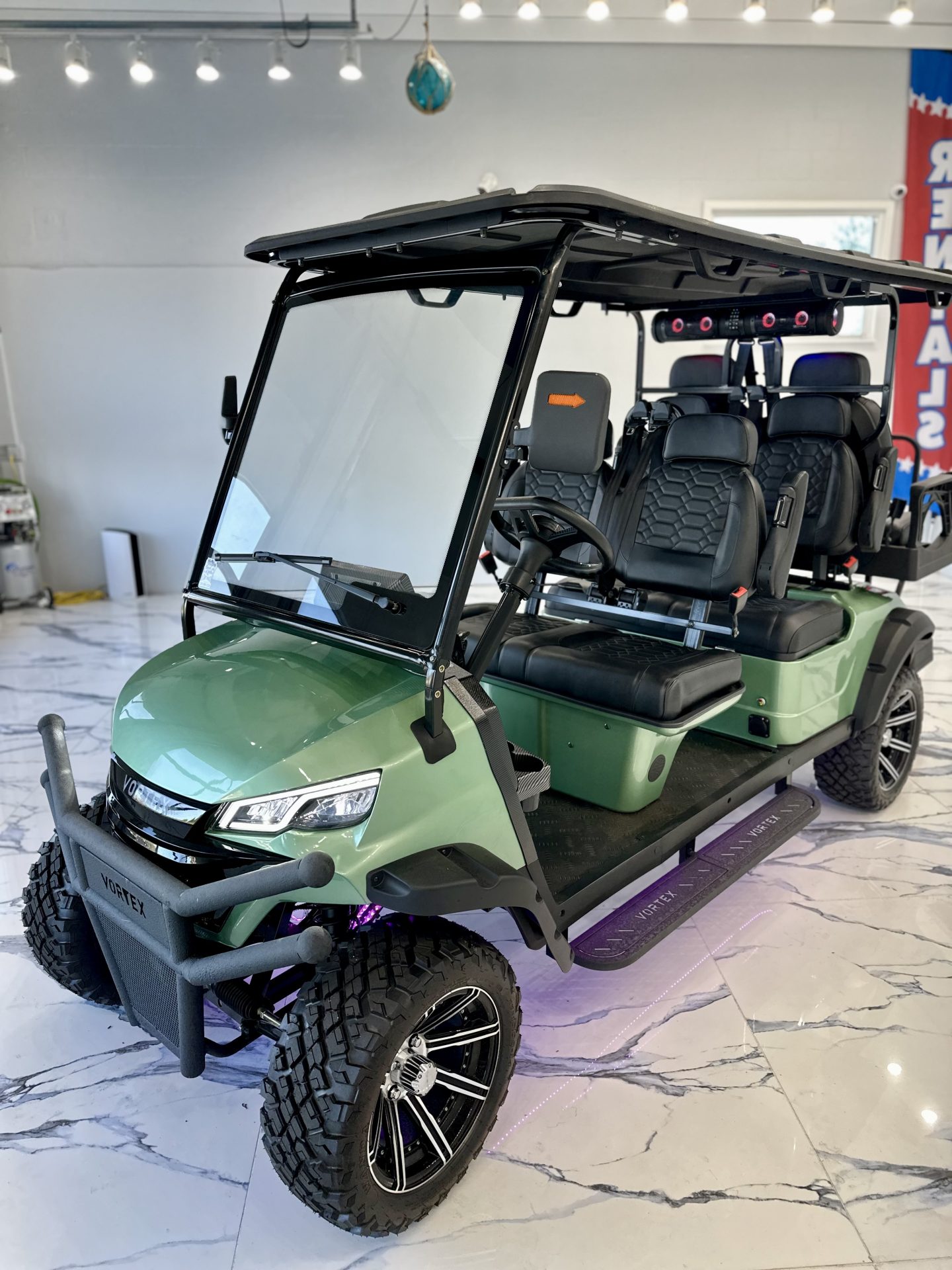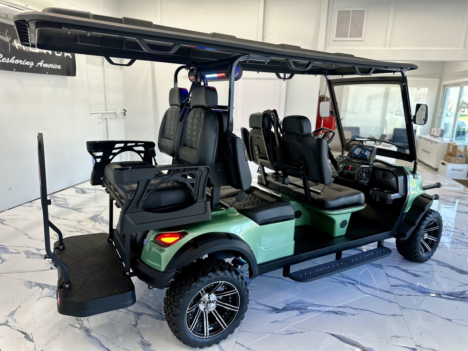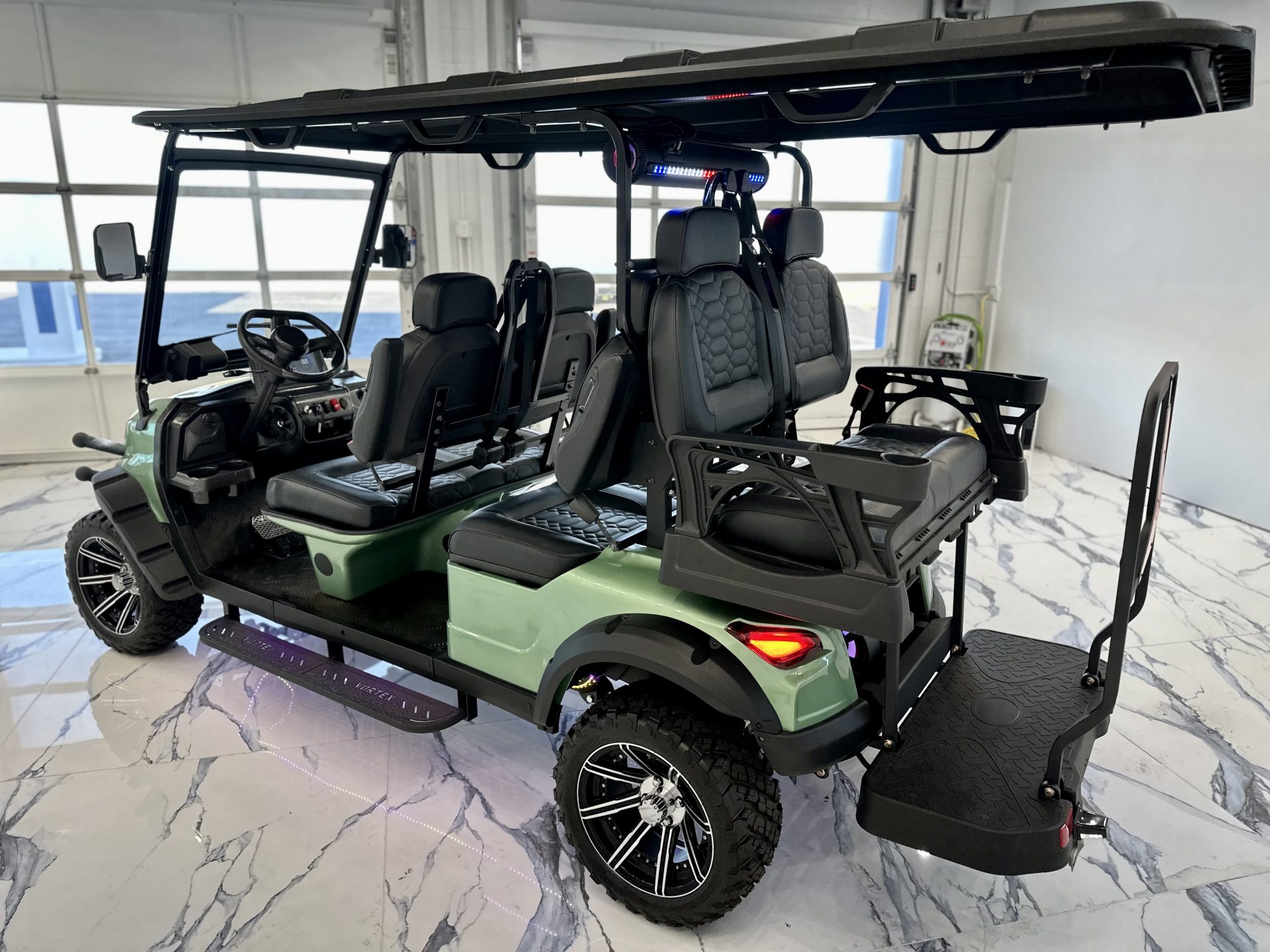 Introducing the 2025 Edge EV Vortex V6, a revolutionary blend of style, performance, and eco-friendly engineering. This brand-new, state-of-the-art golf cart is designed to elevate your casual neighborhood cruises with its cutting-edge features and sleek design. Powering the Vortex V6 is a robust Lithium-Ion battery system, ensuring you enjoy longer rides with shorter charging times. Experience the thrill of whisper-quiet operation combined with impressive torque and acceleration that can handle even the hilliest terrains with ease. This isn’t just a golf cart; it’s a statement of modern technology meeting luxury. With a spacious seating capacity for six passengers, the Vortex V6 ensures everyone can join the adventure. Plush, ergonomically designed seats provide maximum comfort, while the ample legroom and premium materials make every ride feel first-class. The 2025 Vortex V6 doesn’t just stop at performance and comfort. Its sleek, aerodynamic design is complemented by vibrant, high-quality finishes that make it stand out in any setting. Advanced LED lighting not only adds a touch of sophistication but also enhances visibility during those twilight rounds or evening cruises. Safety is paramount in the Vortex V6, featuring the latest in safety technology to protect you and your passengers. From its stable, durable frame to advanced braking systems, this golf cart is built to keep everyone secure while enjoying the ride. Step into the future of personal transport with the 2025 Edge EV Vortex V6, where innovation meets elegance. Ready to redefine your ride? The future awaits with the Edge EV Vortex V6!