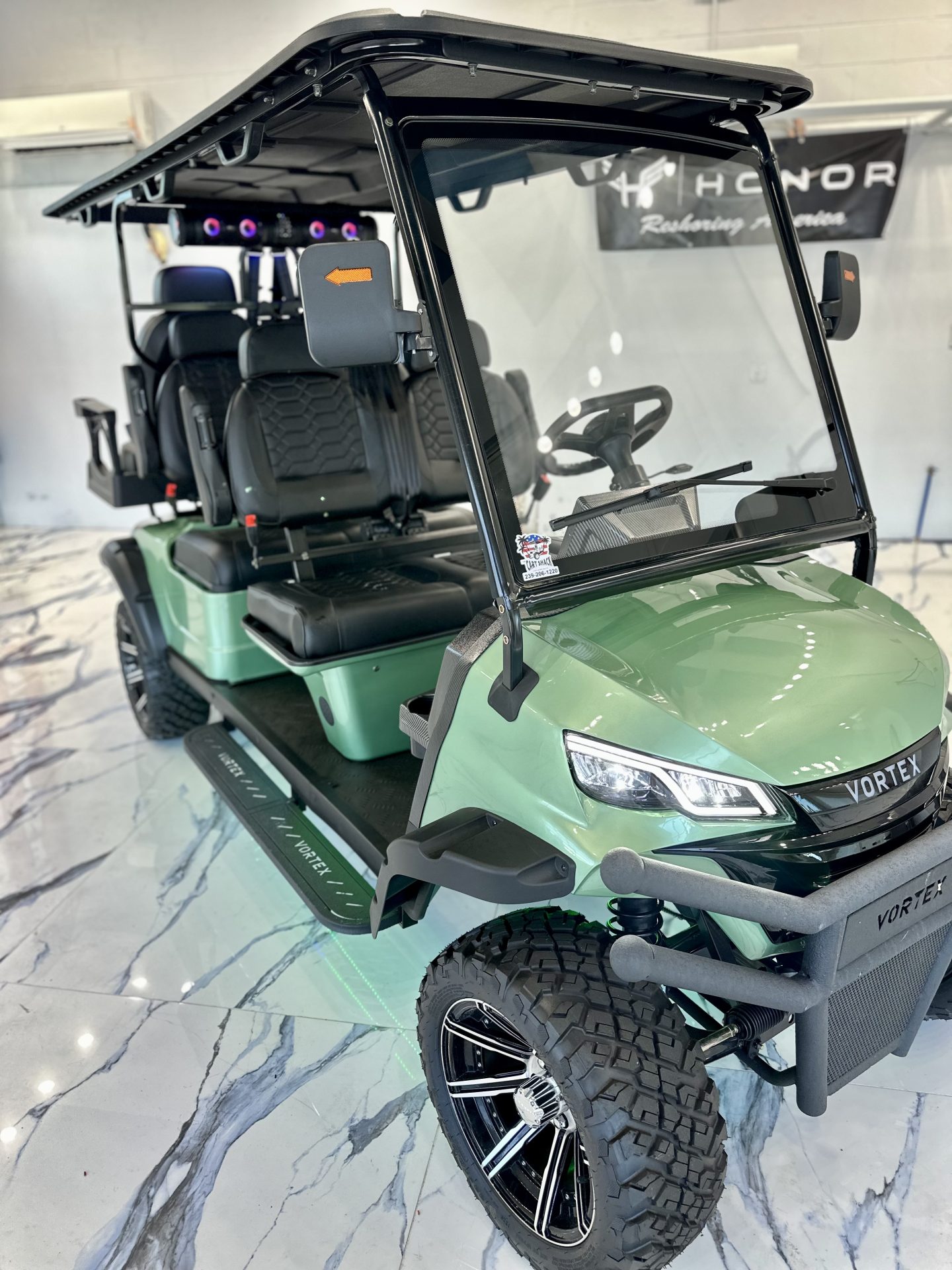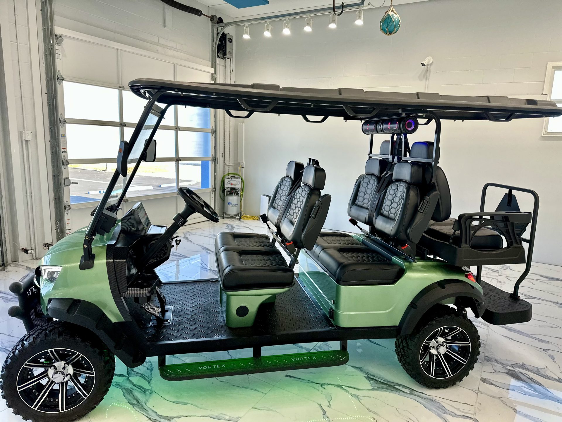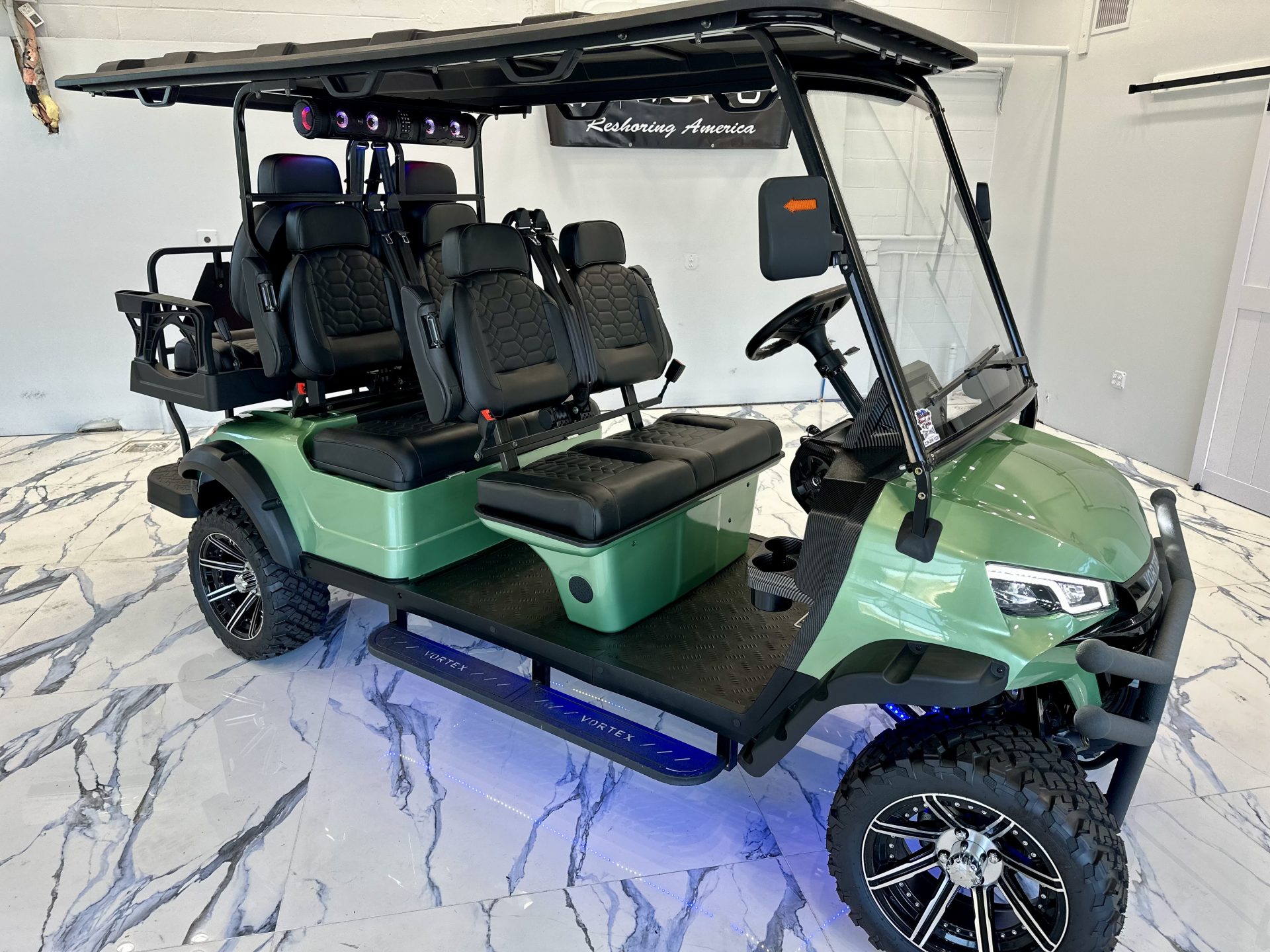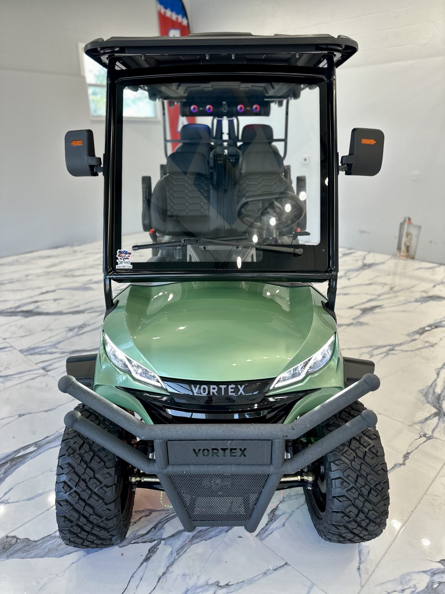 Introducing the 2025 Edge EV Vortex V6, a revolutionary blend of style, performance, and eco-friendly engineering. This brand-new, state-of-the-art golf cart is designed to elevate your casual neighborhood cruises with its cutting-edge features and sleek design. Powering the Vortex V6 is a robust Lithium-Ion battery system, ensuring you enjoy longer rides with shorter charging times. Experience the thrill of whisper-quiet operation combined with impressive torque and acceleration that can handle even the hilliest terrains with ease. This isn’t just a golf cart; it’s a statement of modern technology meeting luxury. With a spacious seating capacity for six passengers, the Vortex V6 ensures everyone can join the adventure. Plush, ergonomically designed seats provide maximum comfort, while the ample legroom and premium materials make every ride feel first-class. The 2025 Vortex V6 doesn’t just stop at performance and comfort. Its sleek, aerodynamic design is complemented by vibrant, high-quality finishes that make it stand out in any setting. Advanced LED lighting not only adds a touch of sophistication but also enhances visibility during those twilight rounds or evening cruises. Safety is paramount in the Vortex V6, featuring the latest in safety technology to protect you and your passengers. From its stable, durable frame to advanced braking systems, this golf cart is built to keep everyone secure while enjoying the ride. Step into the future of personal transport with the 2025 Edge EV Vortex V6, where innovation meets elegance. Ready to redefine your ride? The future awaits with the Edge EV Vortex V6!