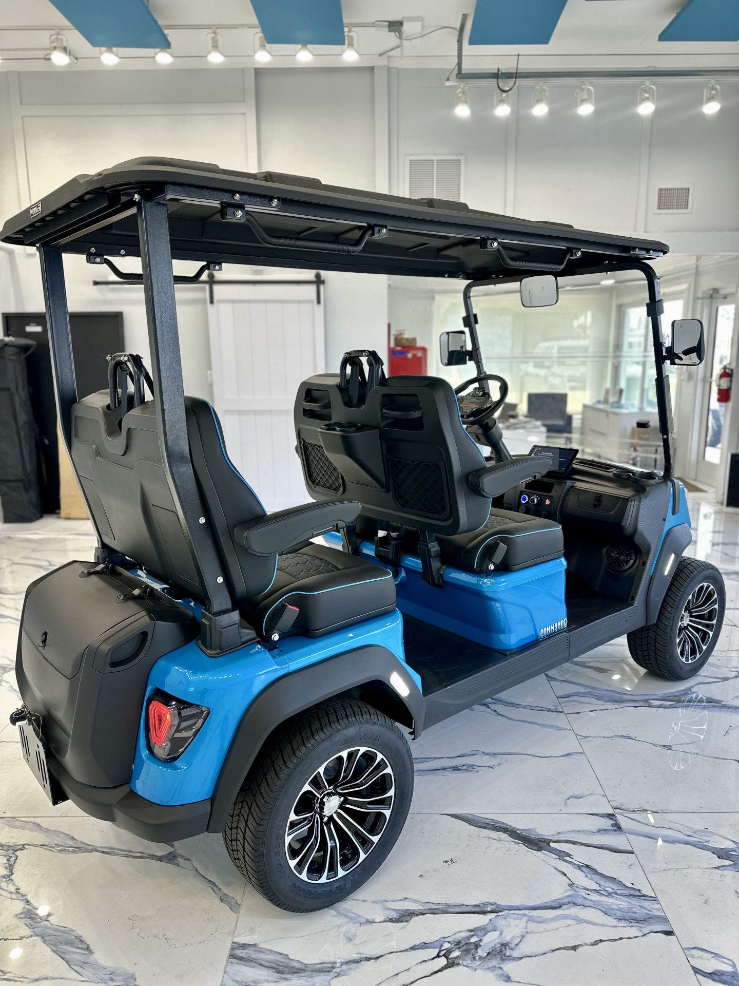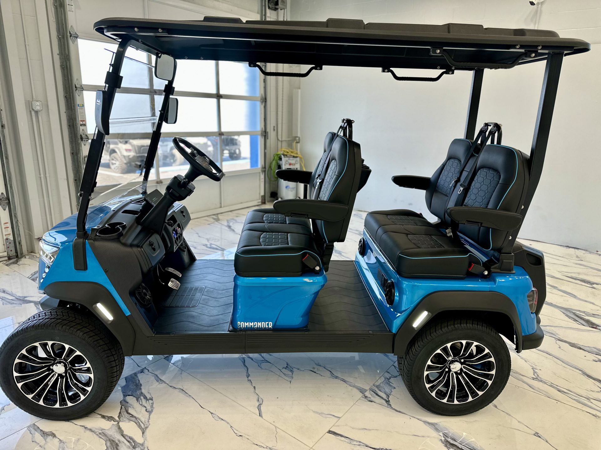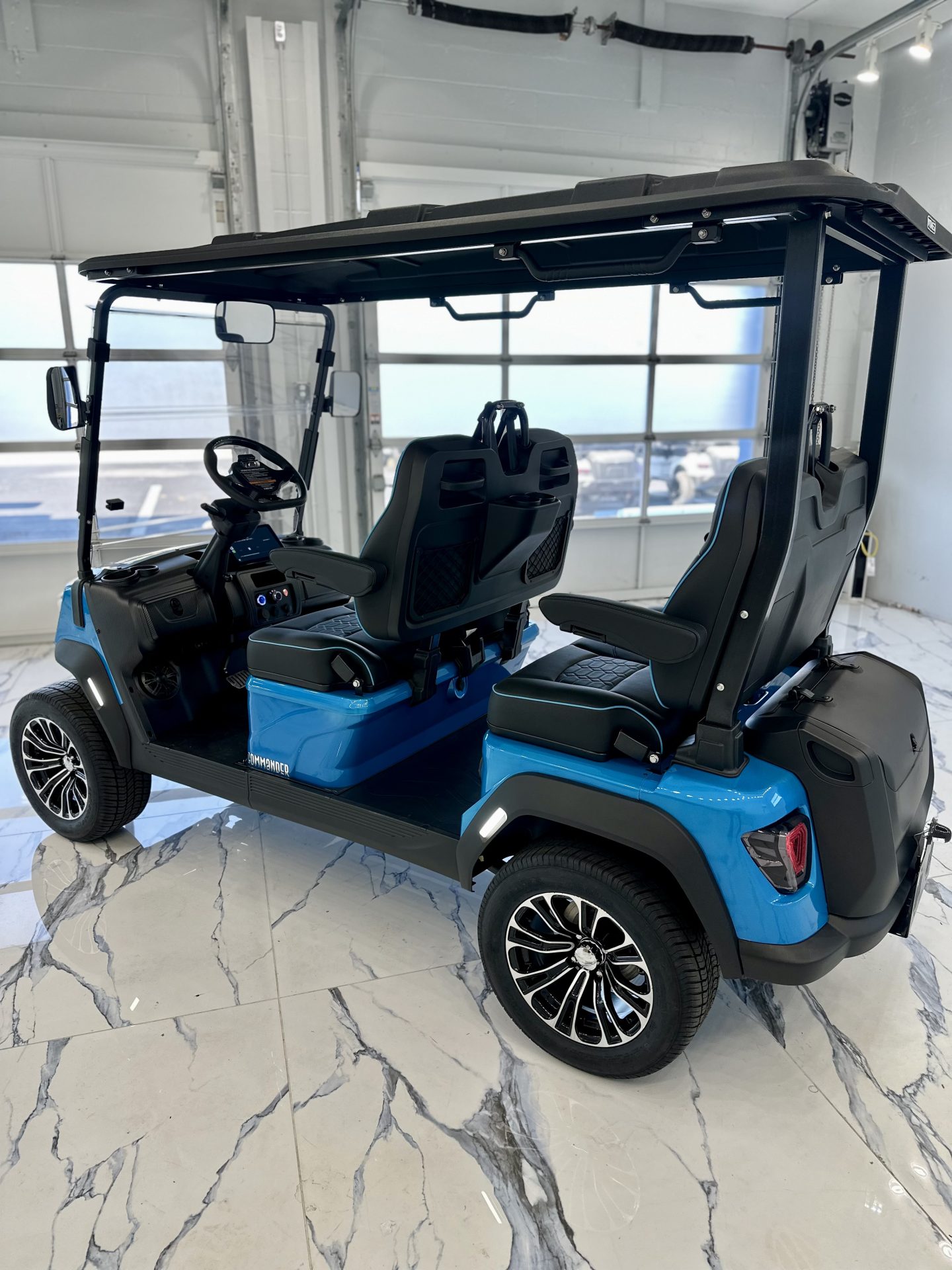Inside, the cabin is thoughtfully designed with premium seating accented by blue contrast stitching, a 10” touchscreen display with integrated sound system and backup camera, USB charging ports, and a full-traction aluminum floor. Subtle luxury touches—including folding side mirrors with integrated turn signals and a metallic paint finish—elevate the Commander well beyond the ordinary.