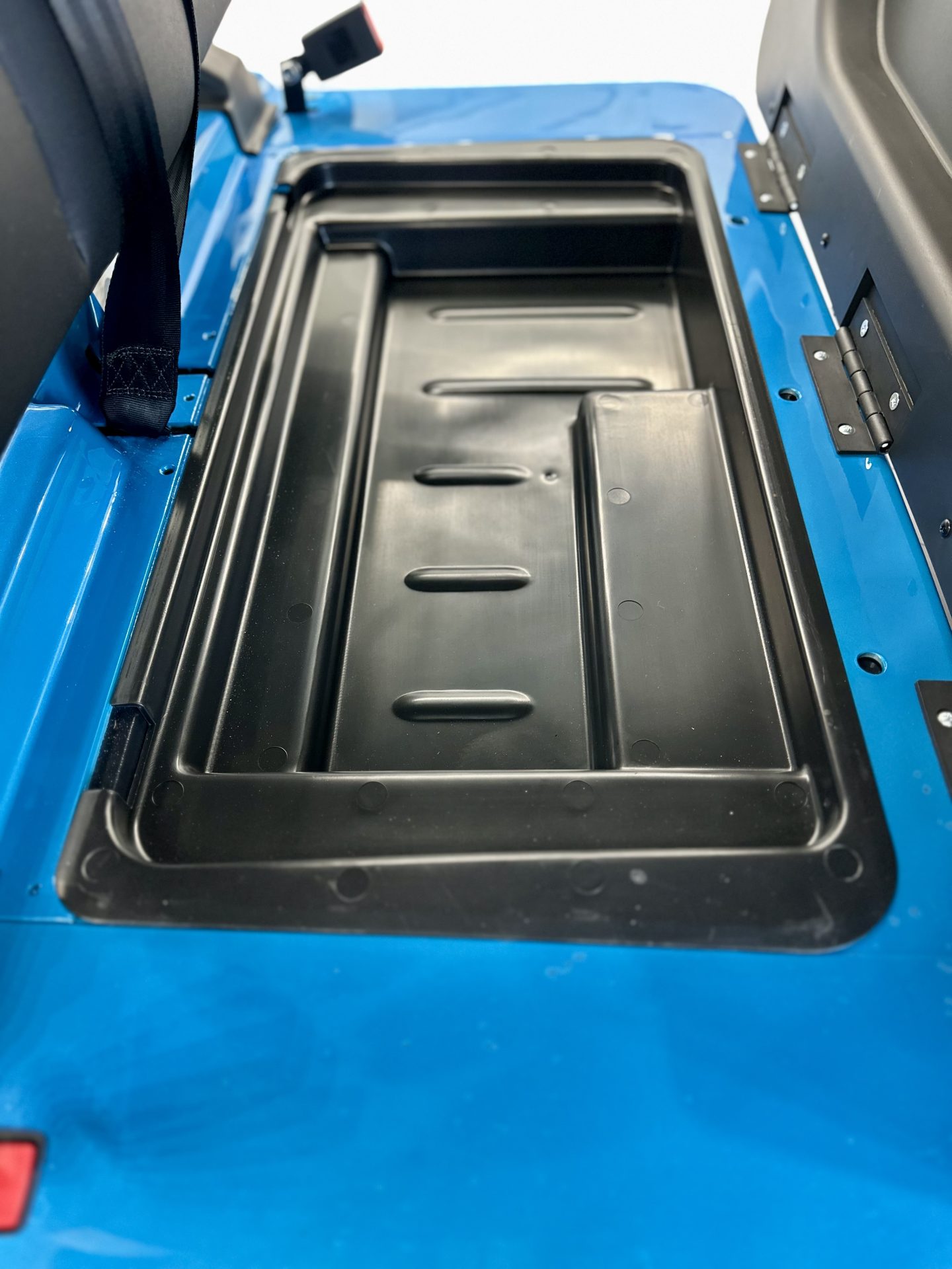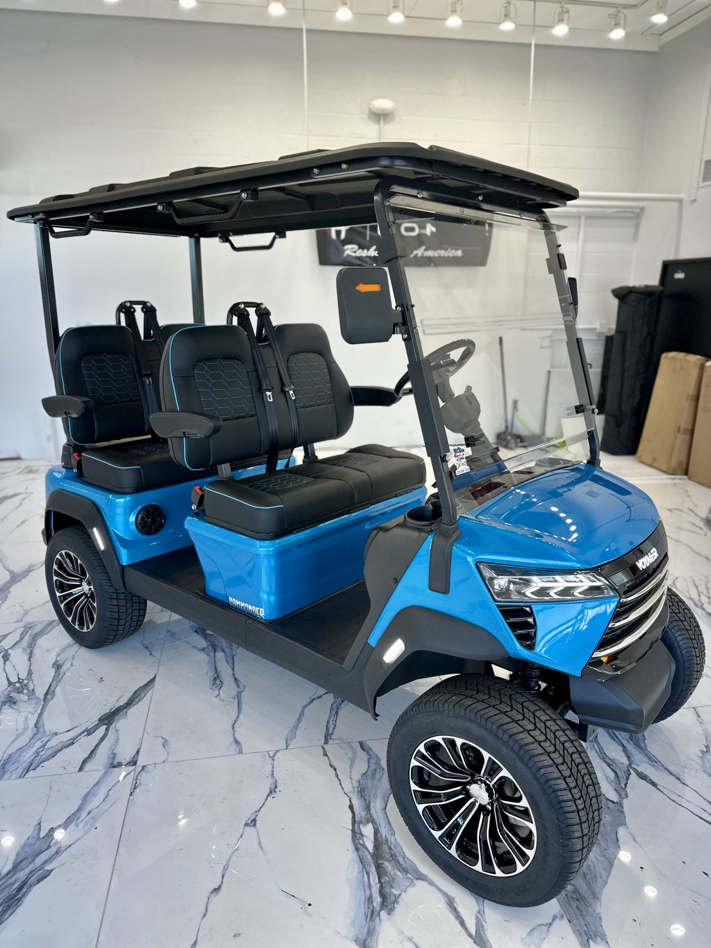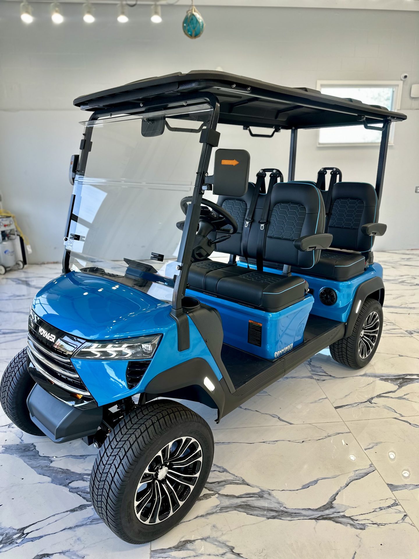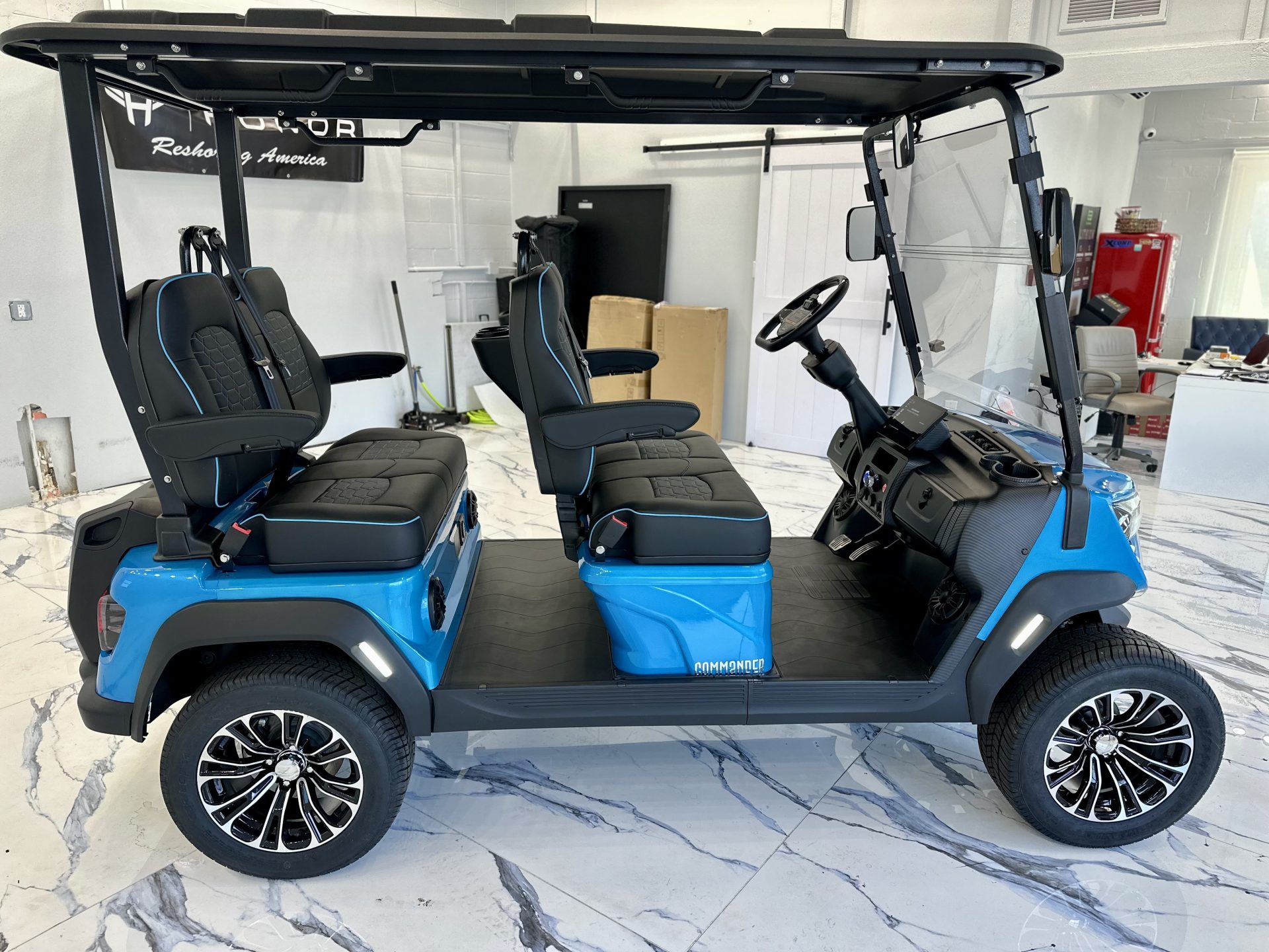 Inside, the cabin is thoughtfully designed with premium seating accented by blue contrast stitching, a 10” touchscreen display with integrated sound system and backup camera, USB charging ports, and a full-traction aluminum floor. Subtle luxury touches—including folding side mirrors with integrated turn signals and a metallic paint finish—elevate the Commander well beyond the ordinary.