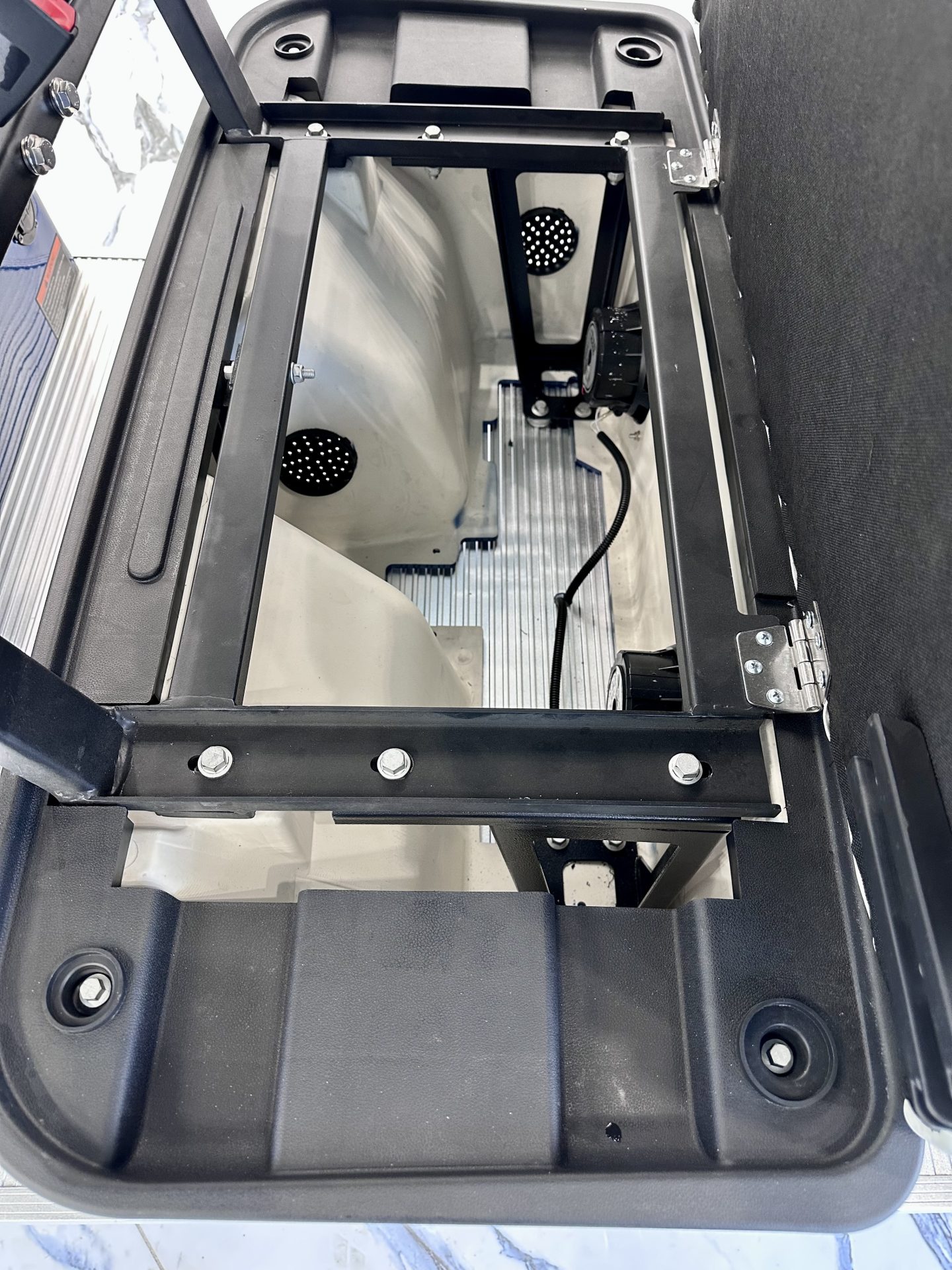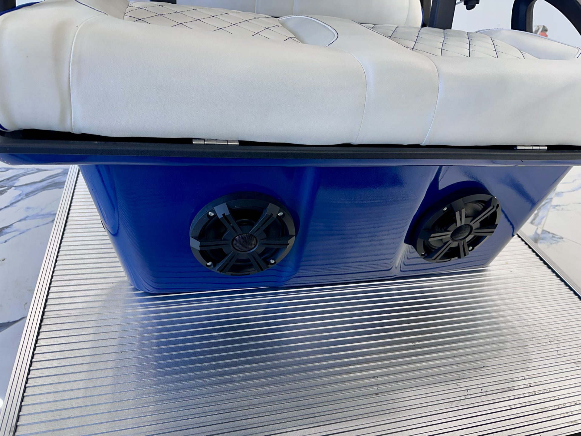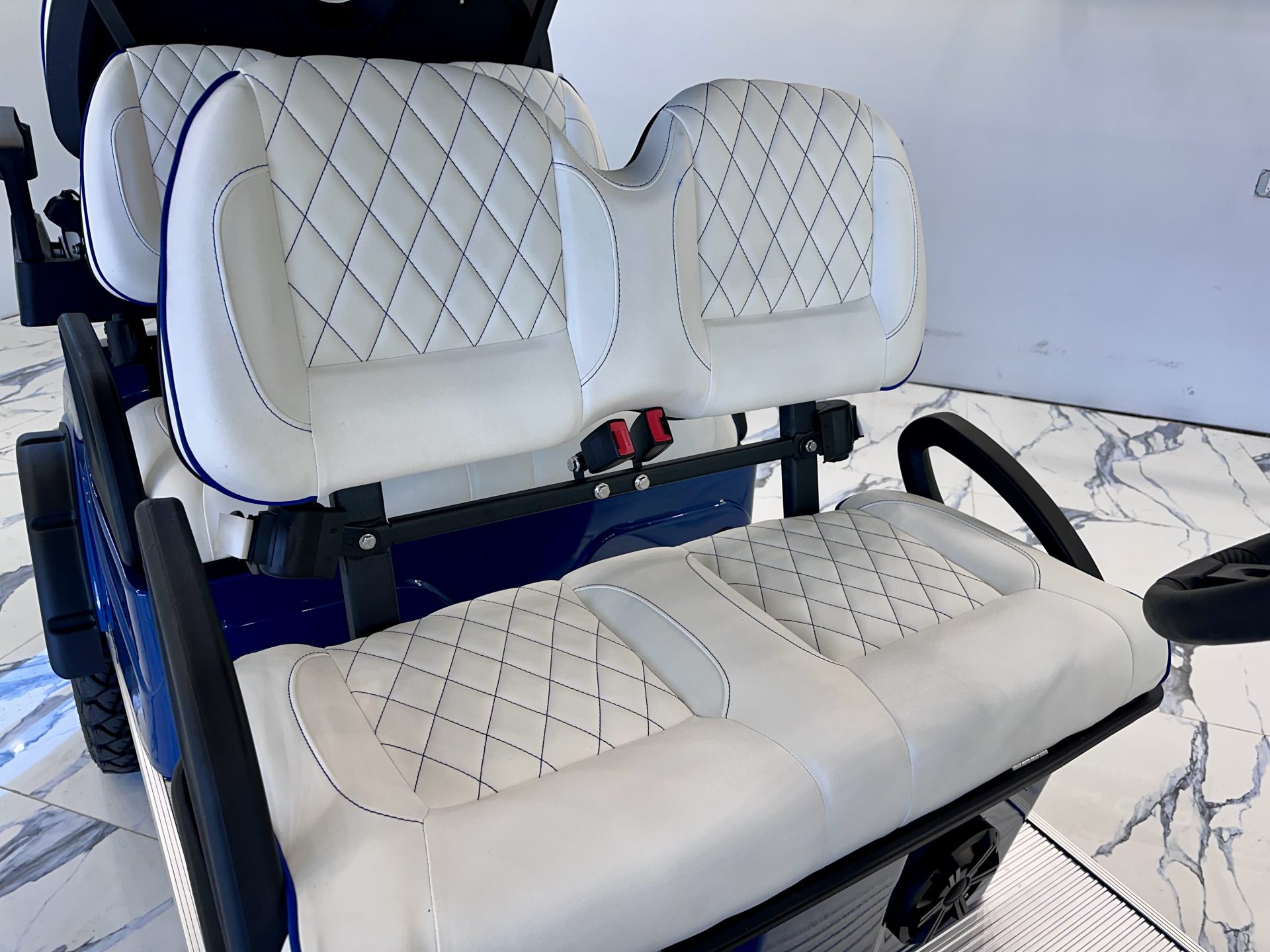 Inside, the cabin is thoughtfully designed with premium seating accented by blue contrast stitching, a 10” touchscreen display with integrated sound system and backup camera, USB charging ports, and a full-traction aluminum floor. Subtle luxury touches like folding side mirrors with integrated turn signals and a metallic paint finish elevate the look well beyond the ordinary.
